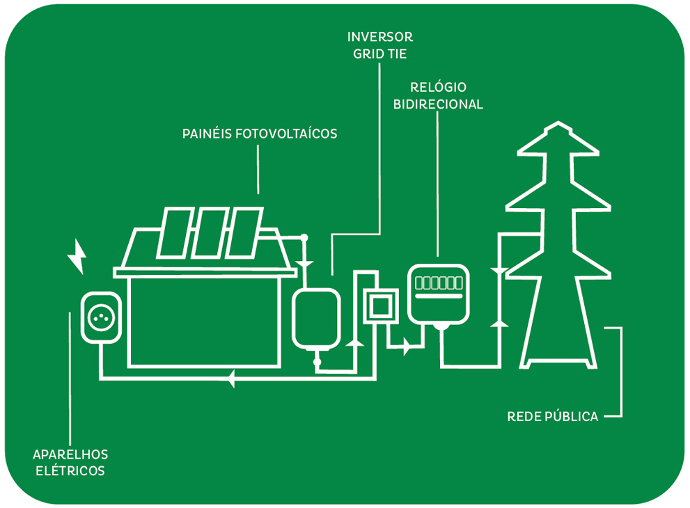 O Painel Fotovoltaico é conectado ao Inversor Solar, a energia que sai desse inversor vai para o quadro de luz, onde a energia é distribuída pela casa. A energia fotovoltaica pode ser usada para TVs, aparelhos eletrônicos, computadores, lâmpadas, eletrodomésticos, ou seja, tudo aquilo que usa energia elétrica e estiver conectado na tomada. Quando você produz mais energia do que está consumindo, este excesso de eletricidade vai para a rede elétrica e vira “créditos de energia” para serem utilizados de noite ou nos próximos meses.